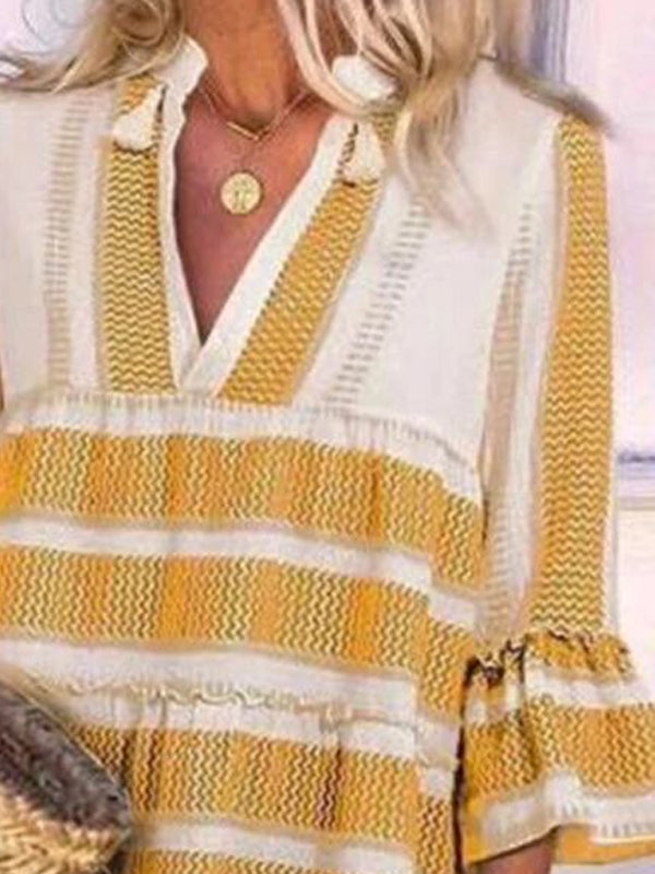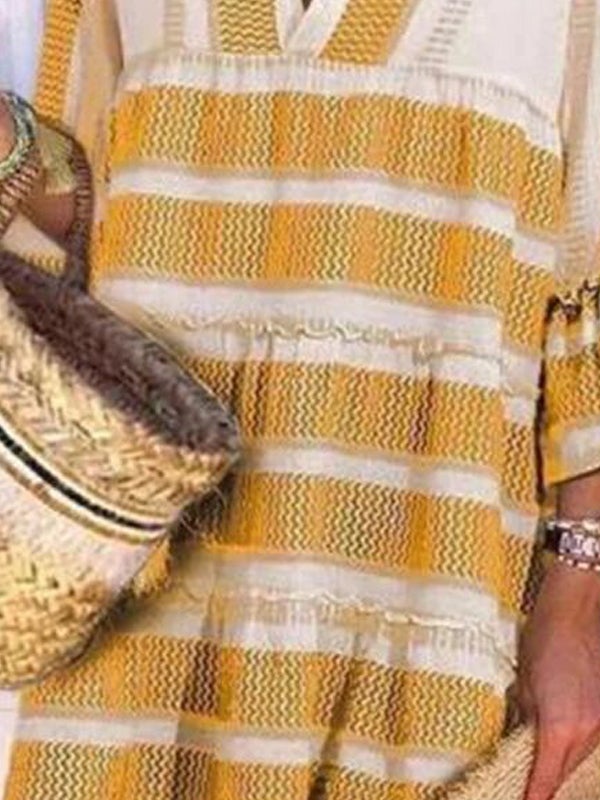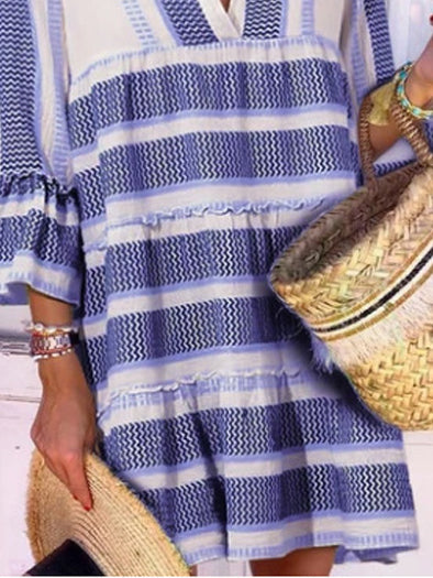 Casual Stripes V Neck 3/4 Sleeve Mini Dress