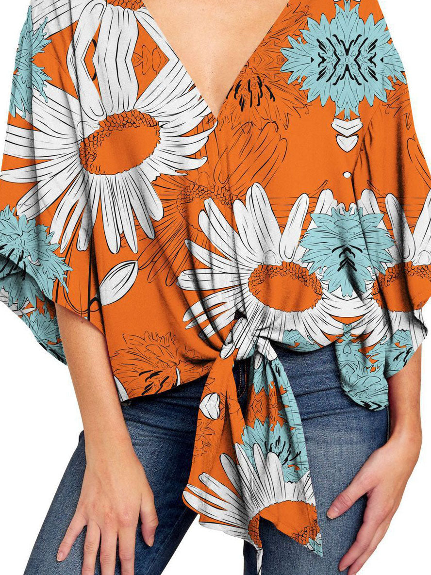 V-neck Mid-sleeve Knotted Print Top