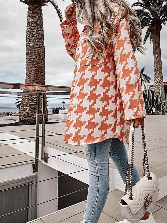 Women's Coats Fashion Loose Long Sleeve Houndstooth Woolen Coat